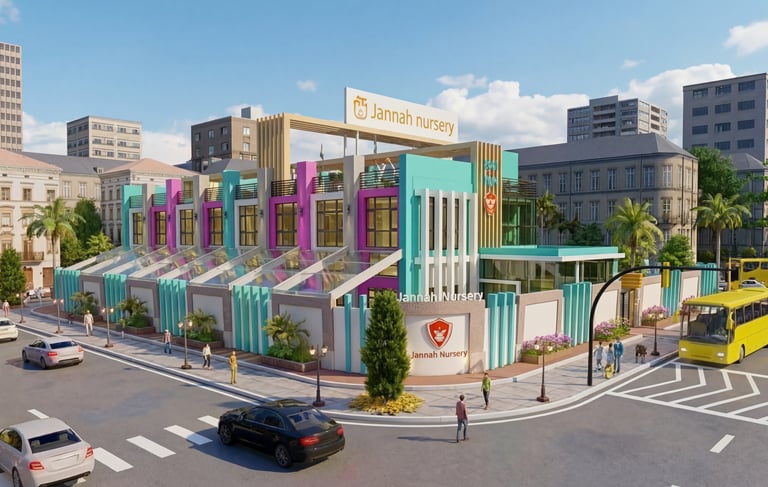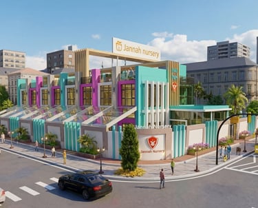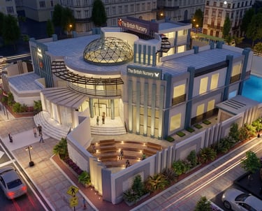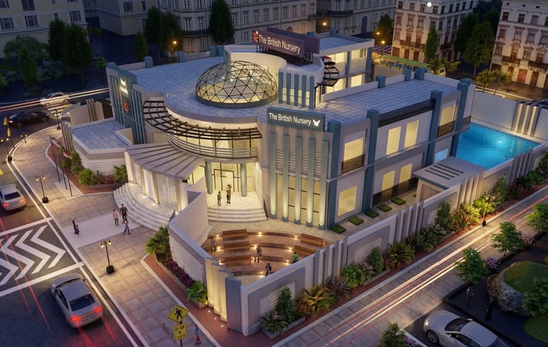 A premium, contemporary early education facility situated on a prominent urban corner. The design balances institutional prestige with a welcoming, child-friendly atmosphere, utilizing a palette of cool grays, whites ,and signature blue accents. Key Features Signature Dome: A central glass geodesic dome crowns the building flooding the core with natural light. Modern Facade: Rhythmic vertical fins provide shading and a distinct visual identity. Functional Layout: The building features integrated covered terraces and a secure, curved perimeter wall to ensure safe, year-round outdoor play