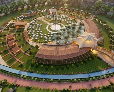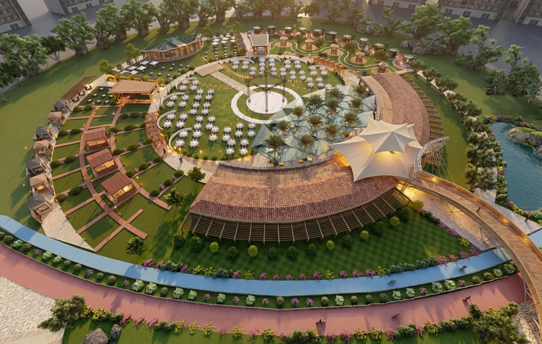 Concept An expansive outdoor recreational facility designed around a central circular layout, integrating cycling infrastructure with leisure amenities in a landscaped park setting.