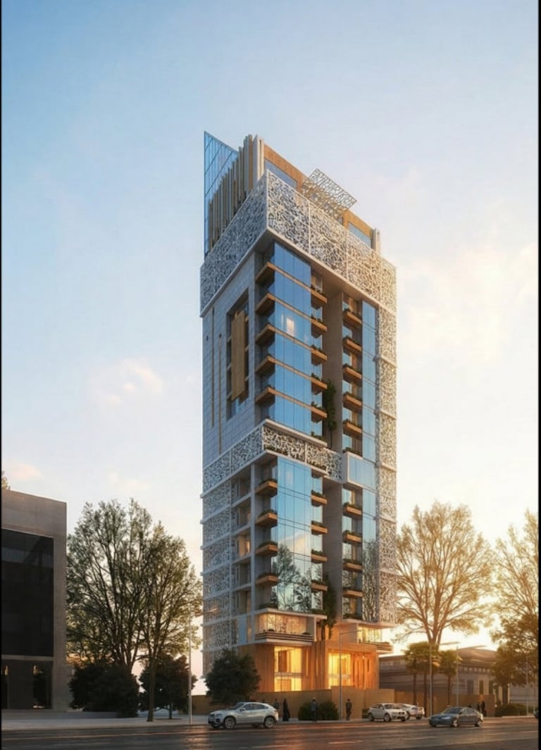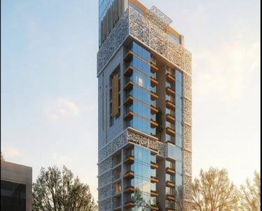 A high-rise office building designed to blend corporate modernity with warmth and sustainability. The tower breaks away from the typical "glass box" aesthetic by integrating natural textures and greenery. Key Features Hybrid Facade: The exterior features a striking combination of sleek blue glazing, warm wood-effect cladding, and decorative white perforated screens (reinterpreting traditional Mashrabiya patterns). Biophilic Design: Recessed balconies and "sky gardens" are integrated into the vertical massing, introducing greenery at various levels to soften the structure. Grand Podium: A double-height, wood-clad entrance creates a welcoming and human-scale experience at street leve